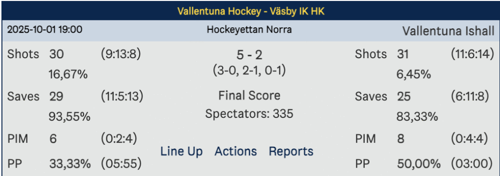 Och det skulle bli första perioden som banade vägen hur matchen skulle sluta. Vallentuna hade marginalerna med sig och kunde kliva ut i omklädningsrum med en 3–0-ledning.