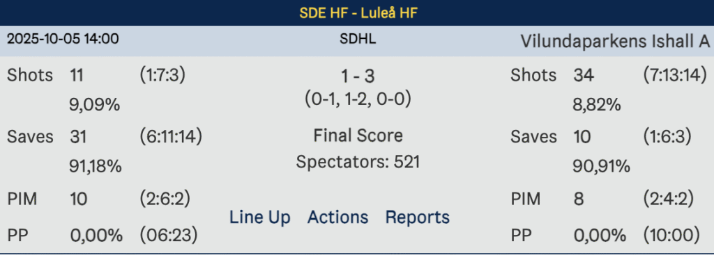 – Förlust i dagens match med 1-3 mot Luleå i en mycket fysisk match där vi tyvärr fick många utvisningar mot oss vilket tog hårt och gjorde vår offensiv något uddlös. Vid underläge med 2-0 i slutet på period 2 gjorde Hilda Ljungberg sitt första SDE mål på ett bra pass från Malia Schneider och vi fick strax därefter chansen i 5-3 i nästan 1,5 minut men utan resultat och i periodens sista sekunder utökade Luleå till 3-1. Vår push i 3 perioden gav några chanser men Luleå försvarade sig bra, säger Elander efter söndagens match.