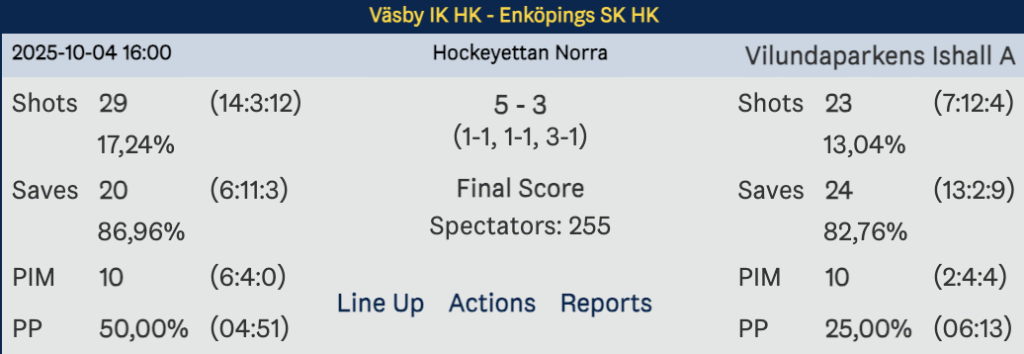 Väsbys hemmapremiär mot Enköping blev under stora delar av matchen jämn, tuff och tajt. Lagen följdes åt fram till 5:46 i tredje perioden. Då stod det 3–3 på matchtavlan.