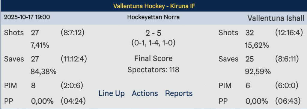 Även om Filip Sundell gjorde 1–1 efter bara 1:46 så skulle Kiruna vara numret större. Vallentuna släppte in tre mål på knappt fem minuter och efter två spelade perioder stod det 1–5 på matchtavlan.